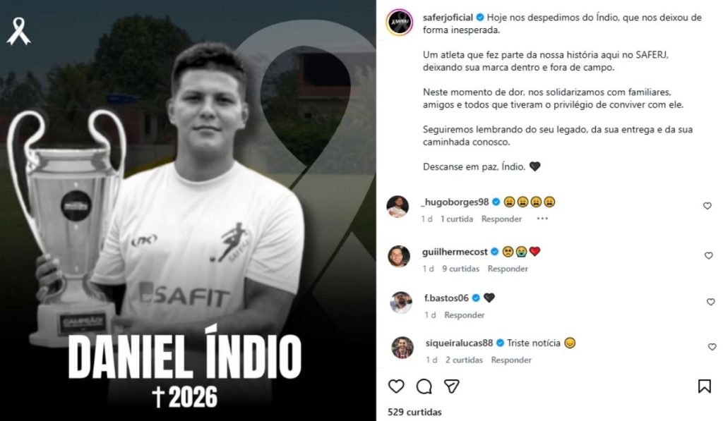 “Hoje nos despedimos do Índio, que nos deixou de forma inesperada. Um atleta que fez parte da nossa história aqui no SAFERJ, deixando sua marca dentro e fora de campo. Neste momento de dor, nos solidarizamos com familiares, amigos e todos que tiveram o privilégio de conviver com ele. Seguiremos lembrando do seu legado, da sua entrega e da sua caminhada conosco. Descanse em paz, Índio”, informou o comunicado da Saferj.
