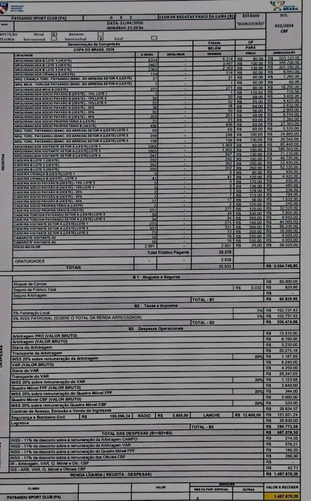 Renda e público de @Paysandu 0 x 2 @VascodaGama, no Estádio Mangueirão, pela partida de ida na quinta fase da Copa do Brasil.