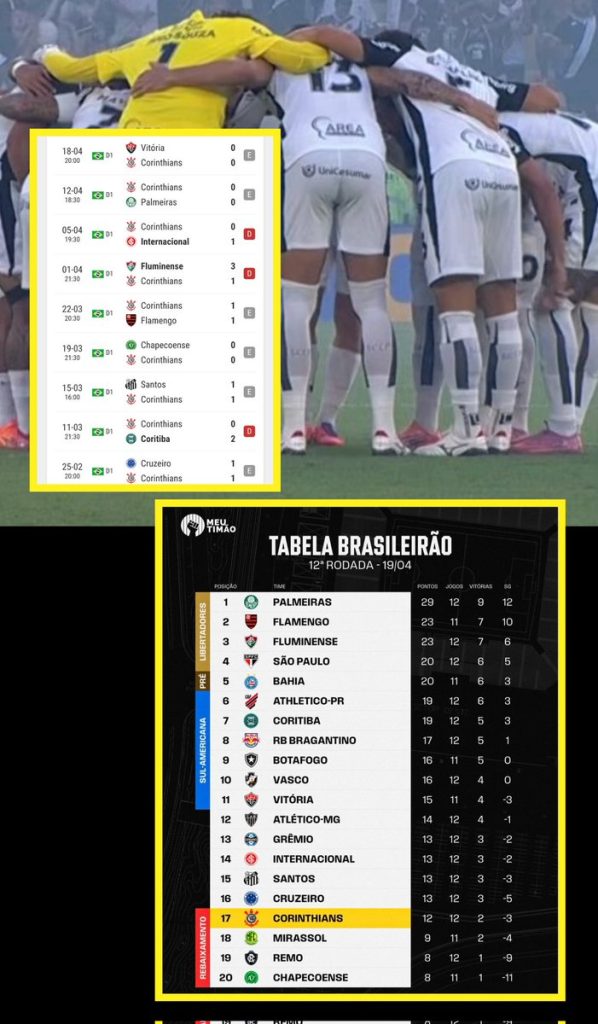 Nove jogos sem vitória cobra seu preço e faz o Corinthians terminar na zona de rebaixamento pela primeira vez este ano.