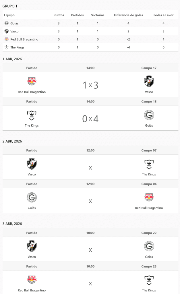 Pela 2ª fase (Classificatória 2 Ouro) da Go Cup Sub-10, o Vasco derrotou o Red Bull Bragantino por 3 a 1 na última 4ª-feira e enfrenta o The King nesta 5ª-feira ao meio-dia. A competição está sendo disputada em Goiânia.