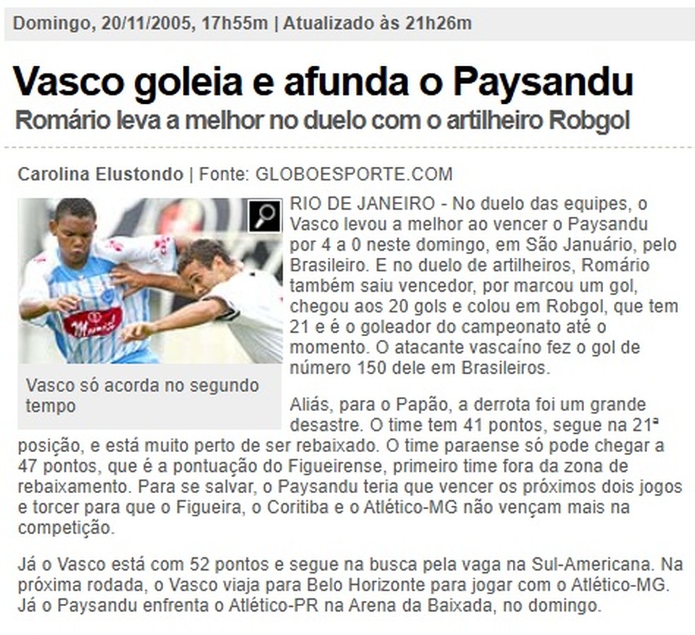 Vinte anos atrás, o Vasco conquistou sua última vitória sobre o Paysandu, no Brasileirão de 2005, com Renato Gaúcho à beira do campo e gols de Romário e Morais. Nesta terça-feira, as duas equipes voltam a se enfrentar, pela Copa do Brasil, em Belém.