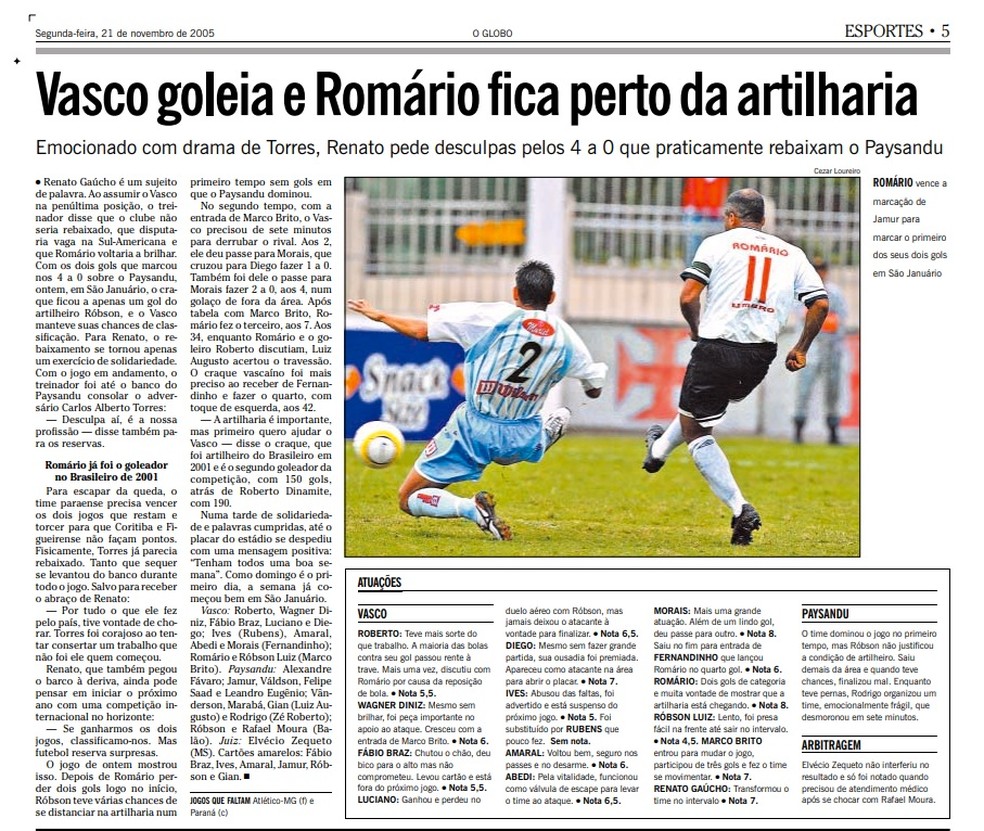 Relembre os gols de Vasco 4 x 0 Paysandu, no Brasileiro de 2005