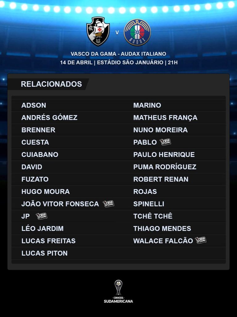 Vasco divulga os relacionados para o jogo contra o Audax Italiano