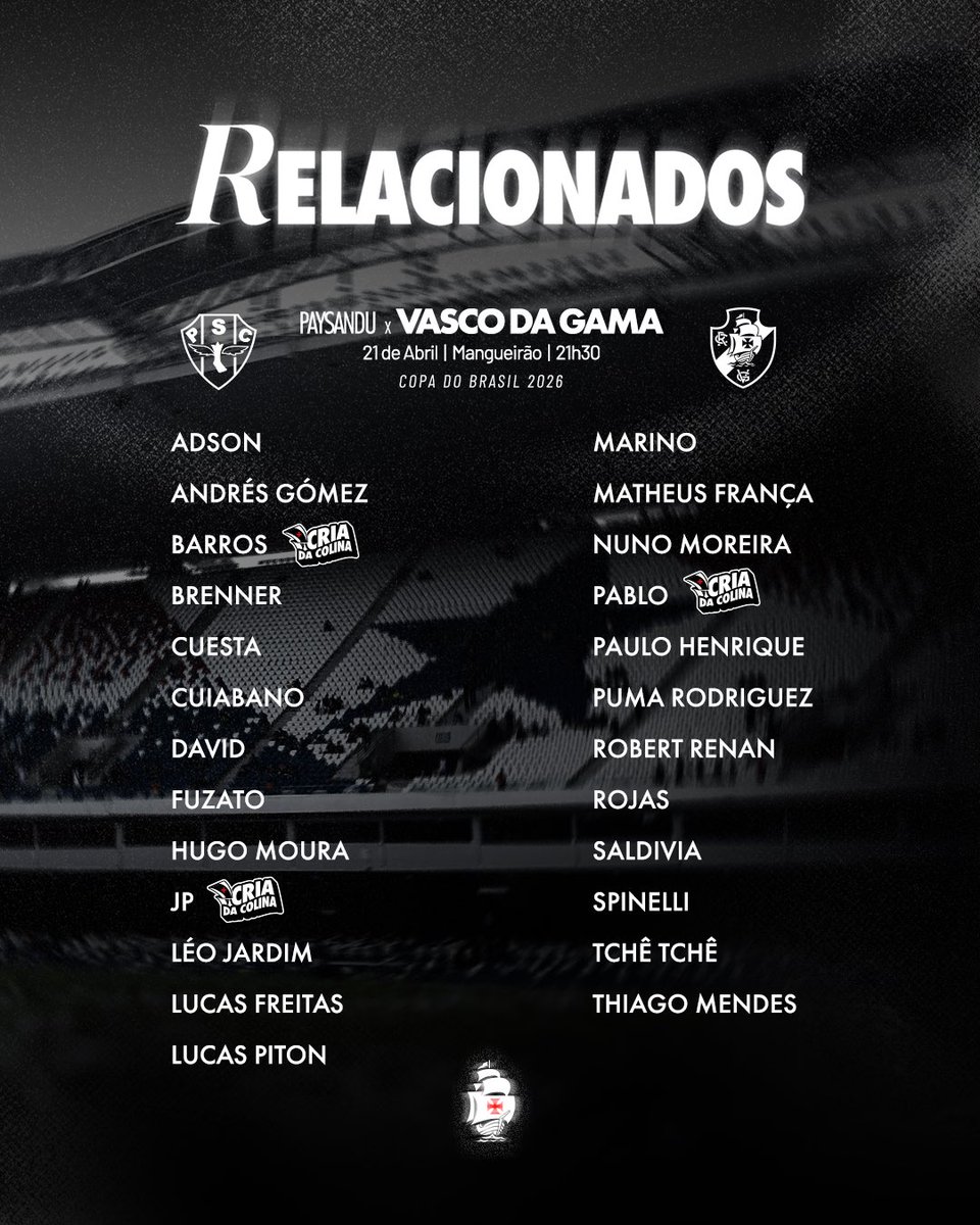 📋 Relacionados do Vasco da Gama para enfrentar o Paysandu na estreia da Copa do Brasil 💢