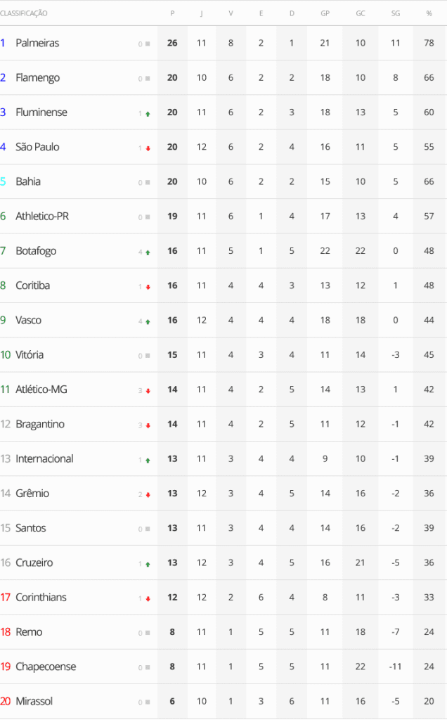 Quatro jogos abriram a 12ª rodada do Campeonato Brasileiro neste sábado. O Vasco, que venceu o São Paulo de virada por 2 a 1, está em 9º lugar. Outros seis jogos serão disputados neste domingo.