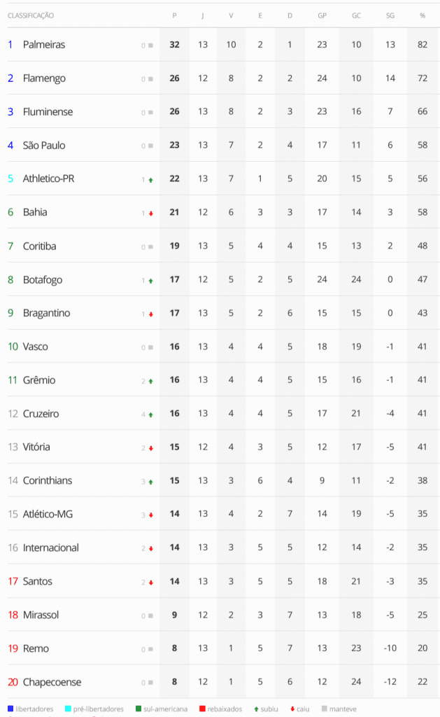 Terminada a 13ª rodada do Campeonato Brasileiro, o Vasco, que perdeu para o Corinthians por 1 a 0, está na 10ª colocação. O Gigante da Colina está a 6 pontos do G5 (zona de classificação à Libertadores) e a 2 pontos do Z4 (zona do rebaixamento).