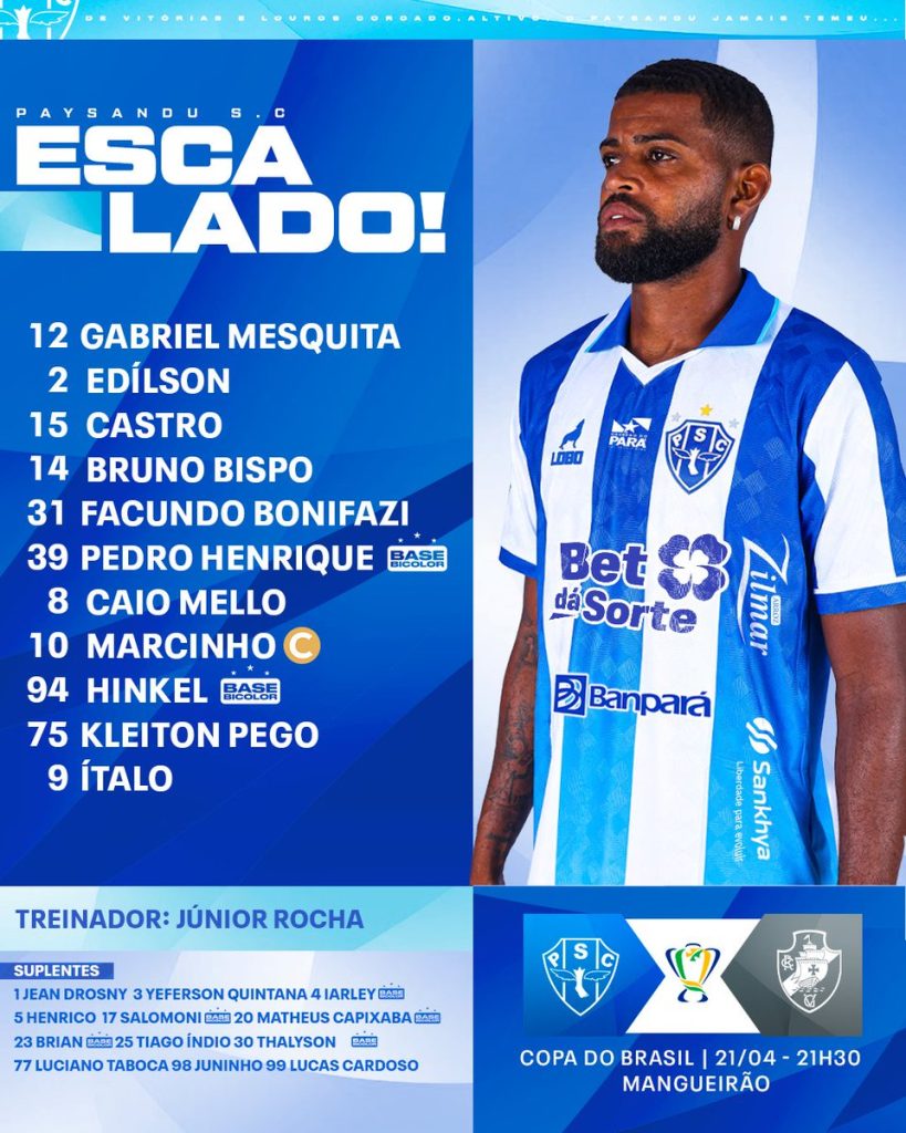 Veja a escalação do Paysandu para o jogo contra o Vasco