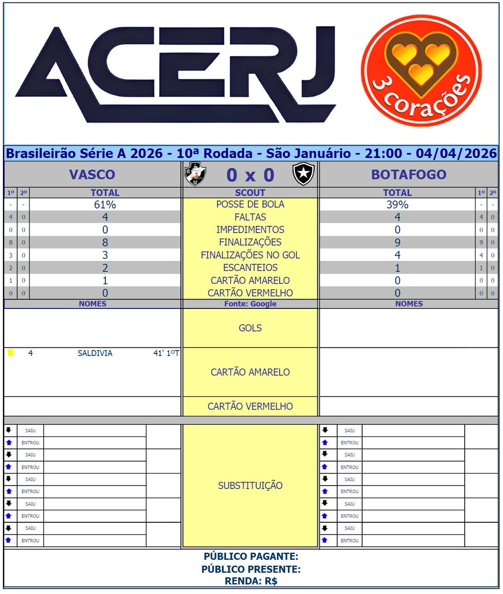 Scout do 1º Tempo de Vasco e Botafogo pela 10ª Rodada do Campeonato Brasileiro 2026 em São Januário (Fonte: Google) #Acerjinforma #brasileirao2026 #VASxBOT #VascodaGama #Botafogo @Brasileirao @VascodaGama @Botafogo